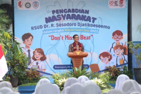 BOJONEGORO,Wartagres.com – Bupati Bojonegoro Setyo Wahono bersama Ketua TP PKK Cantika Wahono menghadiri kegiatan Pengabdian Masyarakat dalam rangka World Heart Day 2025 dengan tema “Don’t Miss a Beat”. Acara yang digelar oleh RSUD Dr. R. Sosodoro Djatikoesoemo ini berlangsung di SMA Negeri 1 Bojonegoro, Kamis (25/9/2025).
