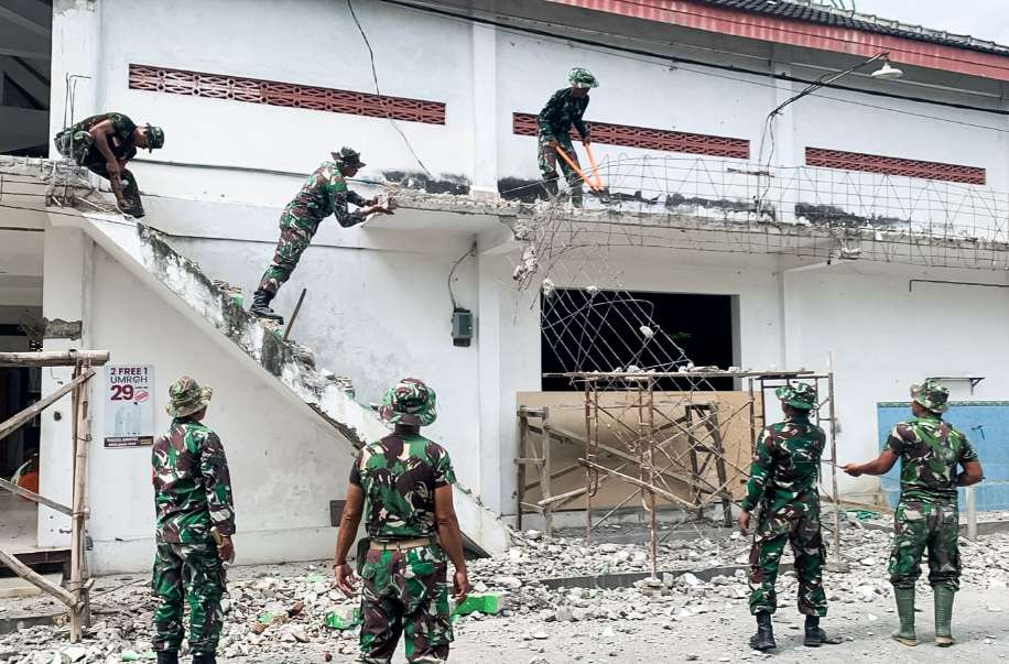 BOJONEGORO,Wartagres.com – Belasan Bintara Pembina Dess (Babinsa) Koramil 10/Kanor Kodim 0813 Bojonegoro bergotong-royong membantu renovasi Masjid Mujahidin Dusun Ager Ager RT.003/RW.002 Desa Tambahrejo Kecamatan Kanor Kabupaten Bojonegoro, Rabu (12/2/2025).