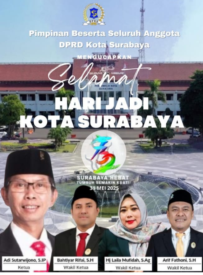 Pimpinan dan Anggota DPRD Surabaya mengucapkan Selamat Hari Jadi Kota Surabaya ke – 732 30/05/202516/06/2025by Redaksi-1263 Viewsby Redaksi Ucapan HJKS. Post Views: 1,263 Baca jugaGarage Day Surabaya 2026, Momen Berbagi dan Peduli kepada Keluarga Prasejahtera di Bulan RamadanEmpat PD Pemkot Surabaya Sabet Predikat Wilayah Bebas Korupsi dari KemenPAN-RBSkor Tembus 91,83, SAKIP AA Surabaya Lampaui Rata-Rata NasionalKomisi B Minta Selama Ramadhan RHU di Surabaya Tutup TotalKomisi D DPRD Surabaya Dorong Penguatan Sosialisasi Reaktivasi BPJS PBI