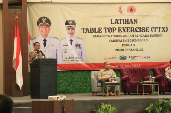 BOJONEGORO,Wartagres.com – Demi memastikan kesiapsiagaan maksimal dalam menghadapi potensi risiko industri, hari ini Bupati Bojonegoro, Setyo Wahono, menghadiri Drill PDKB Table Top Exercise (TTX) Tahun 2025 yang diselenggarakan oleh BPBD (Badan Penanggulangan Bencana Daerah) bertempat di Hotel Eastern Bojonegoro. Kegiatan ini merupakan simulasi kebencanaan yang secara khusus berfokus pada potensi kegagalan teknologi industri, terutama yang berkaitan dengan fasilitas migas Pertamina EP Sukowati Field, dirancang untuk memperkuat koordinasi dan respons lintas sektor, Kamis 19 Juni 2025.