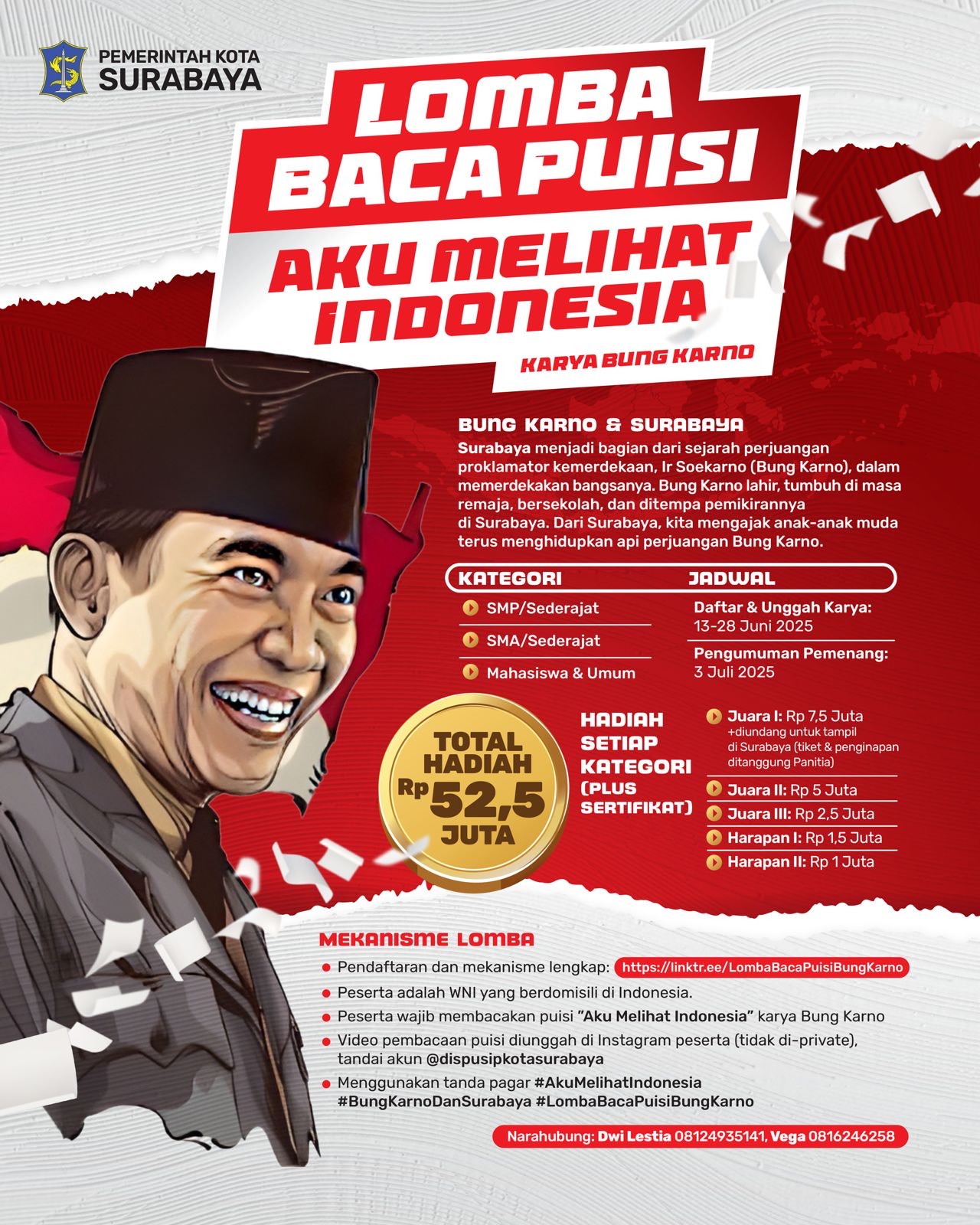 SURABAYA, Wartagres.Com – Pemerintah Kota (Pemkot) Surabaya menggelar lomba baca puisi berjudul “Aku Melihat Indonesia” karya presiden pertama Indonesia, Ir Soekarno (Bung Karno). Lomba berhadiah total Rp 52,5 juta tersebut terbuka untuk kategori SMP/sederajat, SMA/sederajat, dan mahasiswa/umum.