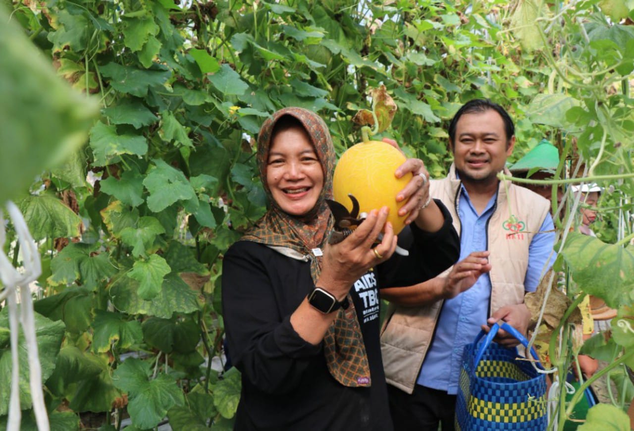 Usai acara jagong gayeng Wakil Bupati Nurul Azizah meninjau dan memanen melon yang telah di kembangkan bersama oleh HKTI. (Pro/Muh)