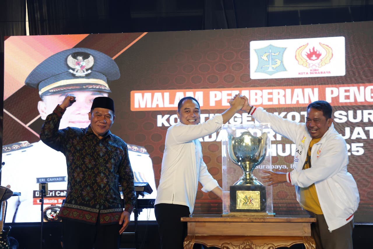 Dalam momen itu, Wali Kota Eri Cahyadi mengungkapkan rasa syukur atas keberhasilan Surabaya mempertahankan gelar juara umum Porprov Jatim 2025 untuk kesembilan kalinya. “Alhamdulillah setelah diverifikasi oleh teman-teman KONI dan disampaikan hasil turun dari verifikasi KONI Jawa Timur, baru kita bagi bonusnya,” kata Wali Kota Eri.