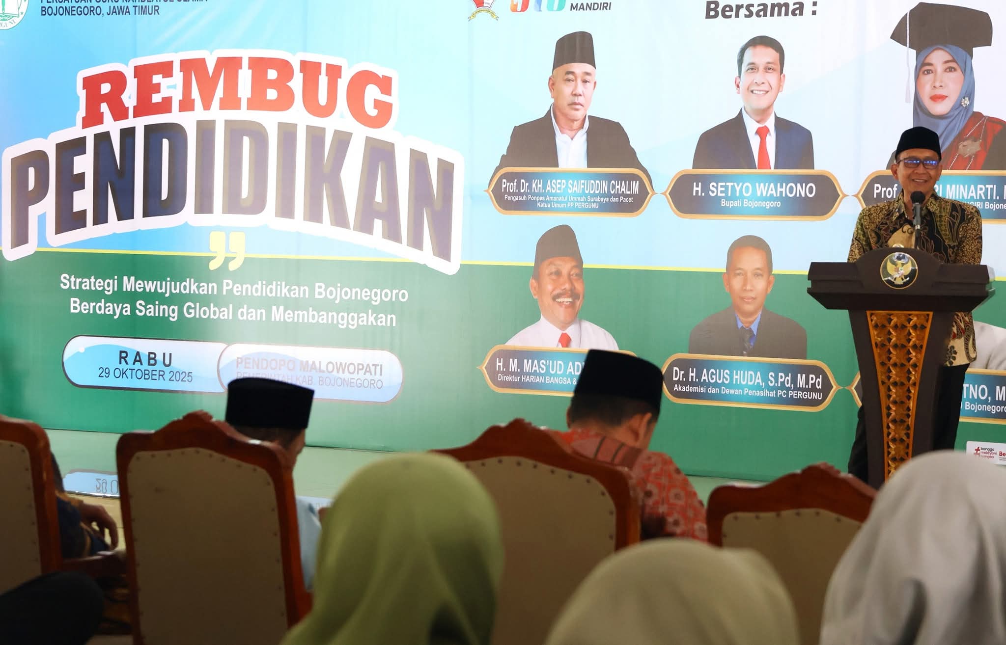 BOJONEGORO,Wartagres.com – Bupati Bojonegoro hadir dalam acara Rembug Pendidikan yang diselenggarakan oleh Pergunu (Persatuan Guru Nahdlatul Ulama) Kab. Bojonegoro, Rabu pagi (29/10/25). Dalam acara yang diselenggarakan di Pendopo Malowopati tersebut Bupati Bojonegoro menekankan bahwa Pendidik harus mampu menghadapi tantangan dalam membentuk generasi penerus yang berkarakter dan pembentukan adab.